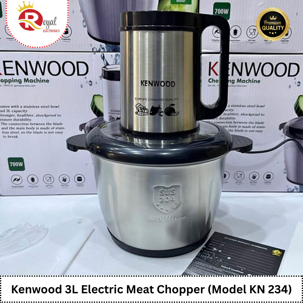 Upgrade your kitchen with the Kenwood 3L Electric Meat Chopper (Model KN 234)—a versatile and efficient appliance designed for effortless meat grinding, chopping, and mixing. Featuring a 3-speed motor, six durable blades, and a 3-liter capacity, this meat chopper delivers consistent results for homemade sausages, burgers, baby food, and more.